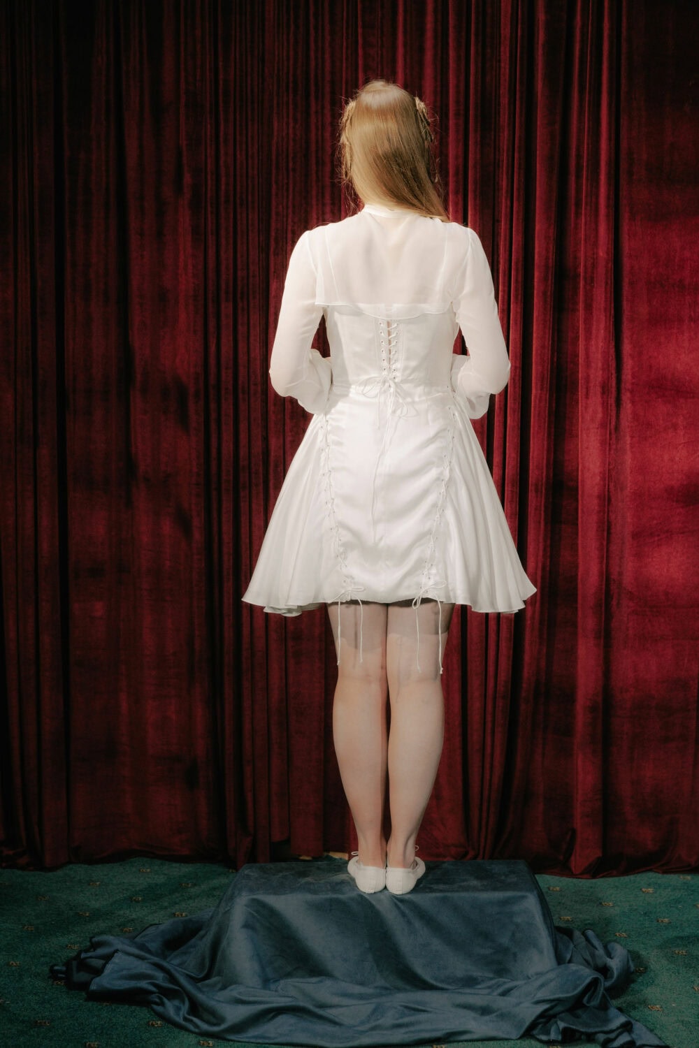 The Margareth Bolero drapes a delicate layer of soft organic silk chiffon, fluid, weightless, and alive in movement. Designed to echo the fleeting charm of The Awakening, it slips over the shoulders like mist, softening structure with effortless grace. For the bride who moves between shadow and light, who knows that mystery is part of her beauty.